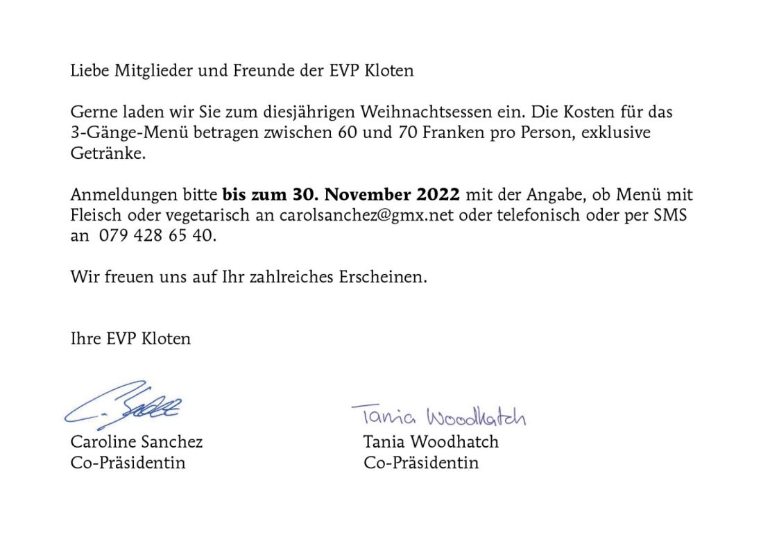Anmeldung bis 30. November an carolsanches@gmx.ch oder per SMS 079428 65 40! Einladung